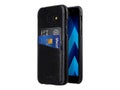 Samsung Galaxy A5 2017 musta suojakuori. Suojakuori on keinonahkaa ja kuoresta löytyy paikka kahdelle kortille. Suojakuoren valmistaja on Melkco.